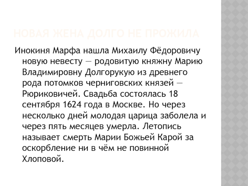 Рюриковичей. Свадьба состоялась 18 сентября 1624 года в Москве. Но через несколько дней молодая царица заболела и через пять месяцев умерла. Летопись называет смерть Марии Божьей Карой за оскорбление ни в чём не повинной Хлоповой.