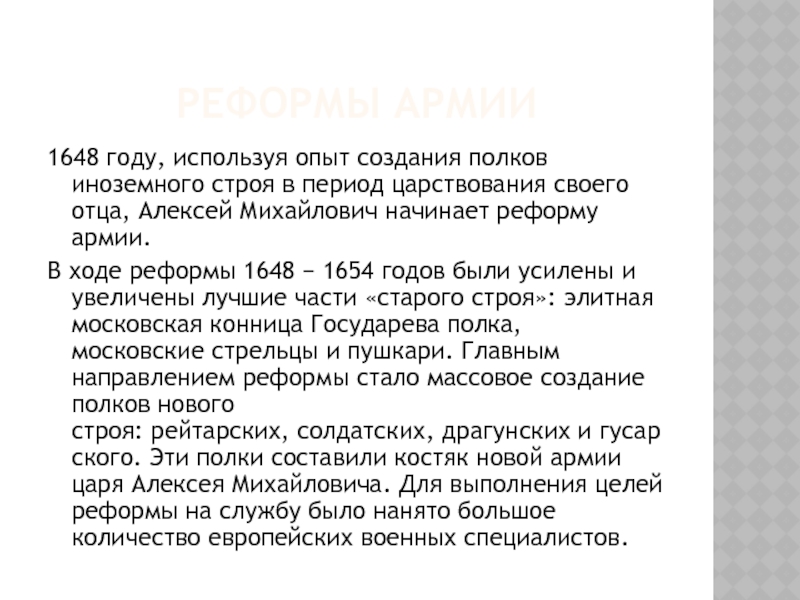 − 1654 годов были усилены и увеличены лучшие части «старого строя»: элитная московская конница Государева полка, московские стрельцы и пушкари. Главным направлением реформы стало массовое создание полков нового строя: рейтарских, солдатских, драгунских и гусарского. Эти полки составили костяк новой армии царя Алексея Михайловича. Для выполнения целей реформы на службу было нанято большое количество европейских военных специалистов.