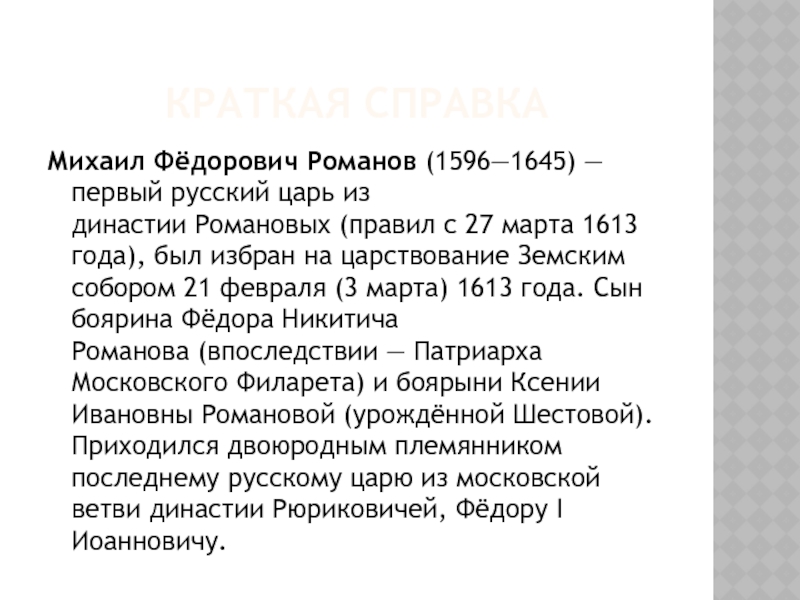 Михаил Фёдорович Романов (1596—1645) — первый русский царь из династии Романовых (правил с