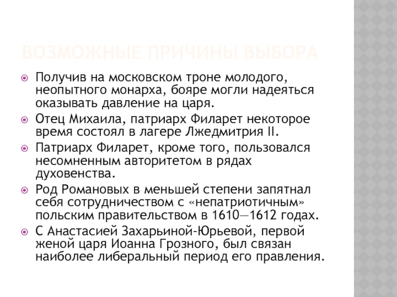 Род Романовых в меньшей степени запятнал себя сотрудничеством с «непатриотичным» польским правительством в 1610—1612 годах.