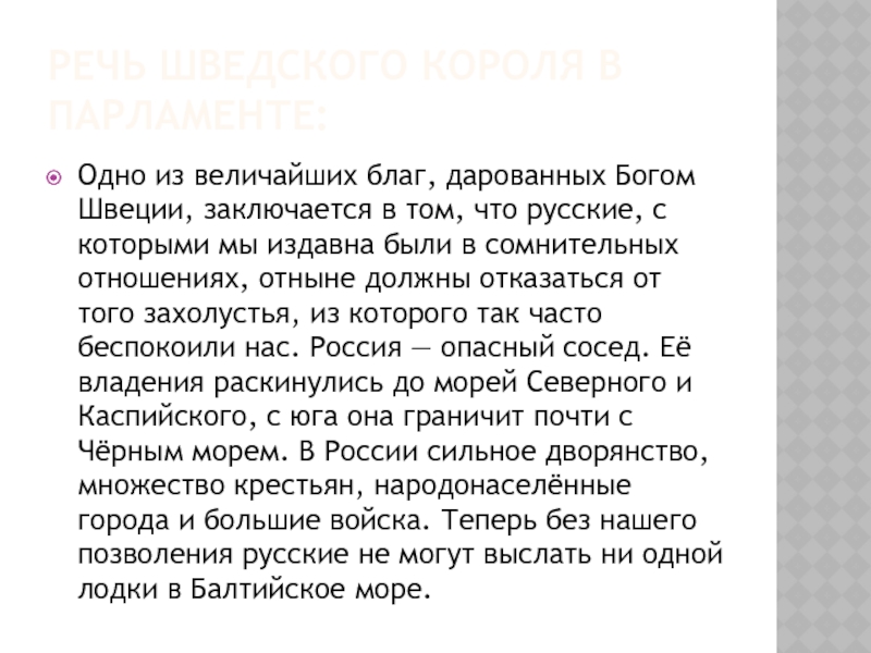 были в сомнительных отношениях, отныне должны отказаться от того захолустья, из которого так часто беспокоили нас. Россия — опасный сосед. Её владения раскинулись до морей Северного и Каспийского, с юга она граничит почти с Чёрным морем. В России сильное дворянство, множество крестьян, народонаселённые города и большие войска. Теперь без нашего позволения русские не могут выслать ни одной лодки в Балтийское море.