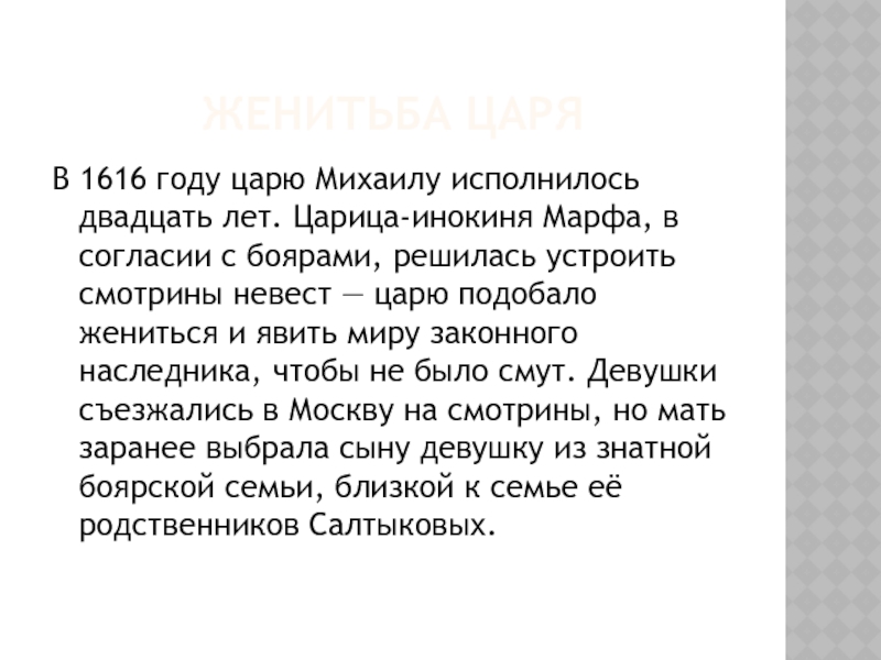 и явить миру законного наследника, чтобы не было смут. Девушки съезжались в Москву на смотрины, но мать заранее выбрала сыну девушку из знатной боярской семьи, близкой к семье её родственников Салтыковых.