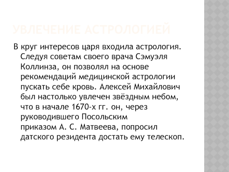 себе кровь. Алексей Михайлович был настолько увлечен звёздным небом, что в начале 1670-х гг. он, через руководившего Посольским приказом А. С. Матвеева, попросил датского резидента достать ему телескоп.