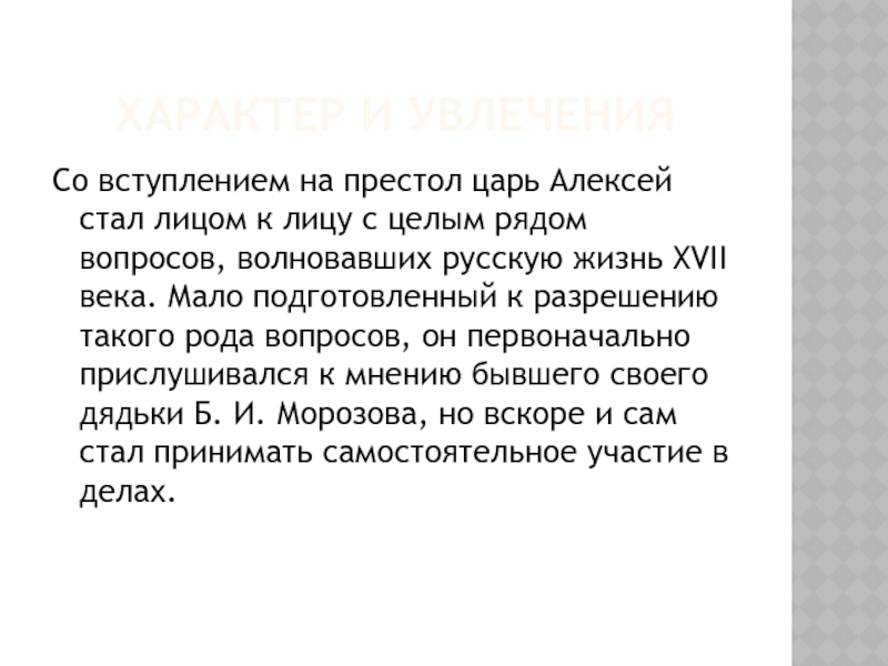 Мало подготовленный к разрешению такого рода вопросов, он первоначально прислушивался к мнению бывшего своего дядьки Б. И. Морозова, но вскоре и сам стал принимать самостоятельное участие в делах.