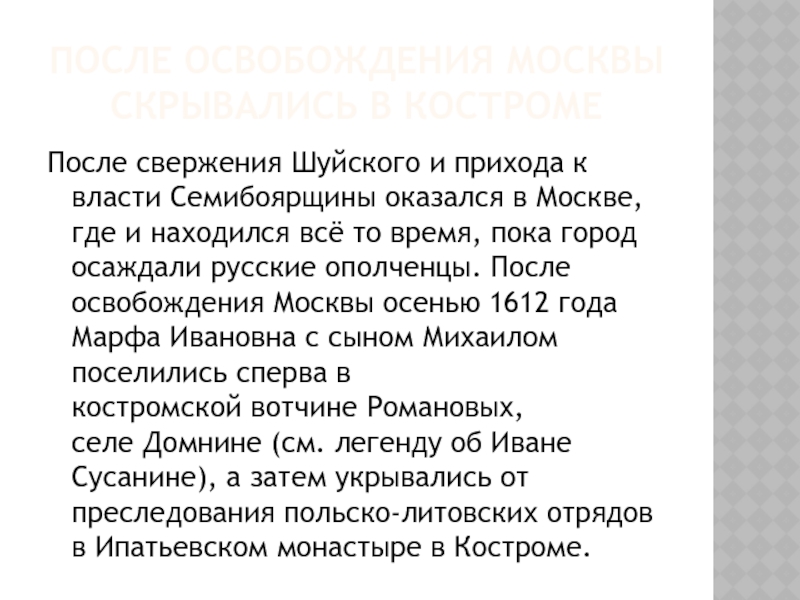 время, пока город осаждали русские ополченцы. После освобождения Москвы осенью 1612 года Марфа Ивановна с сыном Михаилом поселились сперва в костромской вотчине Романовых, селе Домнине (см. легенду об Иване Сусанине), а затем укрывались от преследования польско-литовских отрядов в Ипатьевском монастыре в Костроме.