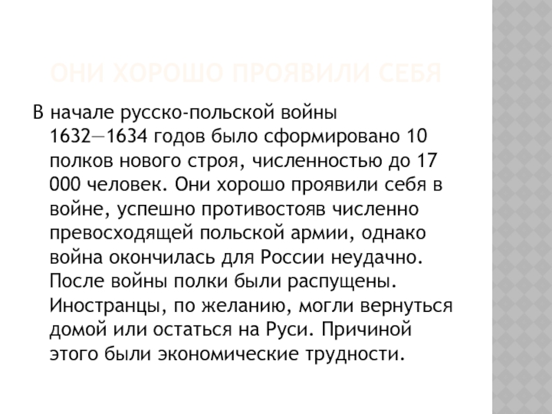 проявили себя в войне, успешно противостояв численно превосходящей польской армии, однако война окончилась для России неудачно. После войны полки были распущены. Иностранцы, по желанию, могли вернуться домой или остаться на Руси. Причиной этого были экономические трудности.