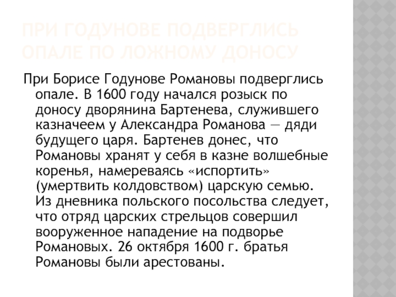Слайд 8При Годунове подверглись опале по ложному доносу