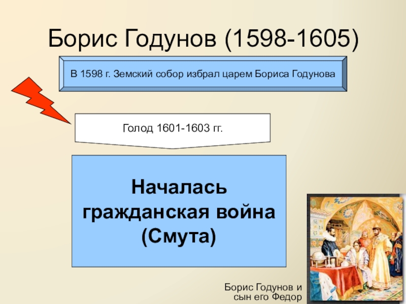 Борис Годунов (1598-1605)Борис Годунов исын его ФедорВ 1598 г. Земский собор избрал царем Бориса Годунова Голод 1601-1603