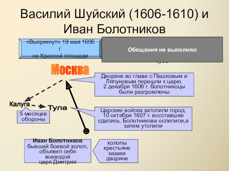 Василий Шуйский (1606-1610) и Иван Болотников«Выкрикнут» 19 мая 1606 г.на Красной площадиКрестоцеловальная записьПравление вместе с Боярской думойНе