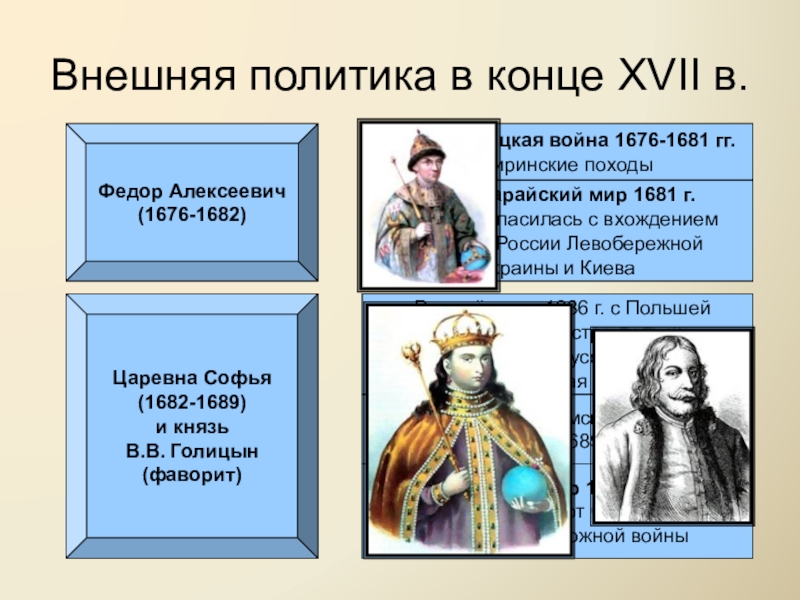 Борис Федорович ГодуновФактическое правление в 1584-1598 г.1591 г.Гибель царевича Дмитрия в Угличе1589 г. – учреждение патриаршества(Иов)1590-1595 гг.русско-шведская войнаТявзинский мир 1595 г. РоссиявернулаИвангород, Ям,Копорье, Корелу1597 г. – указ об «урочных летах»(5-летний срок