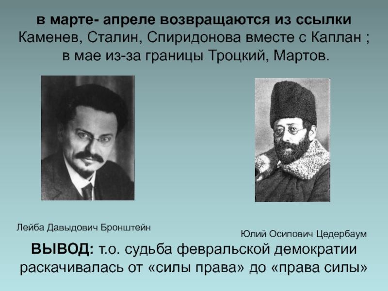 Слайд 5в марте- апреле возвращаются из ссылки Каменев, Сталин, Спиридонова вместе