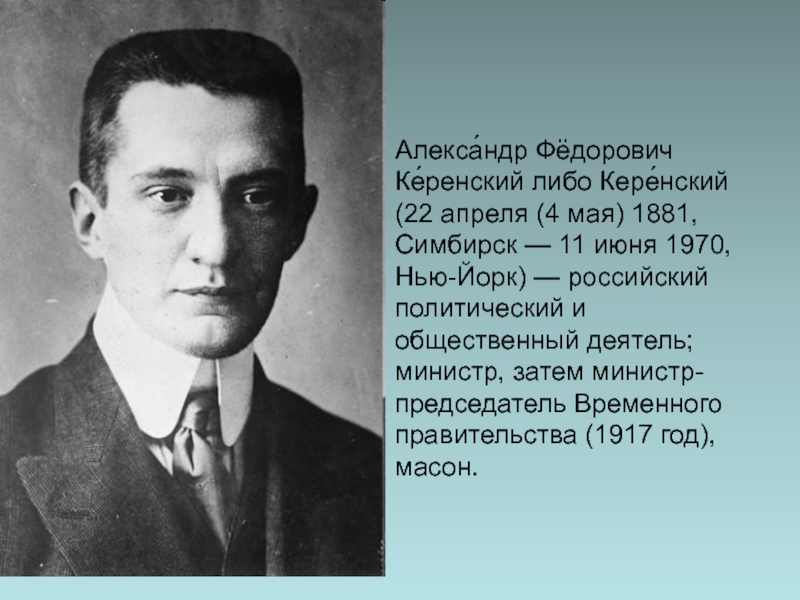 Слайд 20Алекса́ндр Фёдорович Ке́ренский либо Кере́нский (22 апреля (4 мая) 1881,