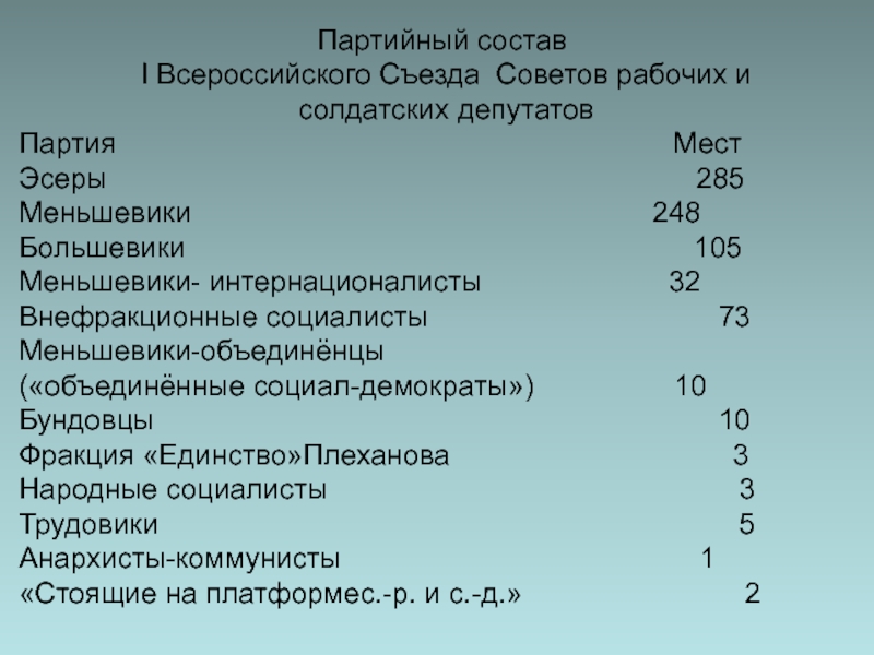 Состав: Эсеры – 285, меньшевики- 248, большевики - 105, и т.д. – всего депутатов 1090 из них с партийной принадлежностью 777.