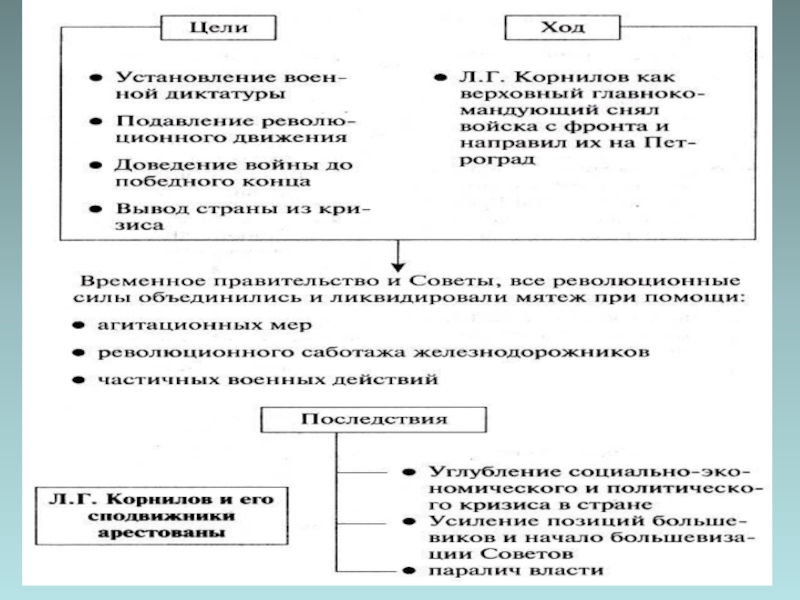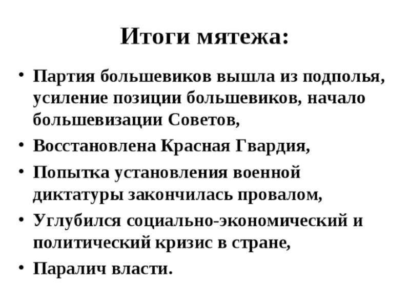 Петрограде, организованное большевиками – первая попытка захвата власти силой. 50 человек убиты, 650 ранено. Правительственные войска ночью взяли под контроль всю столицу. Утром 06. разгром редакции «Правды», дворец Кшесинской, арест большевиков. ЦИК, Советы не поддержали Ленина. Скрываясь от ареста (объявлен государственным преступником) в Разливе вместе с Зиновьевым, т.к. 05.06. опубликованы документы в получении средств на революцию от Германии – врага №1 России. Позже Ленин переезжает в Гельсингфорс, затем ближе к Петрограду в Выборг 17.09.
