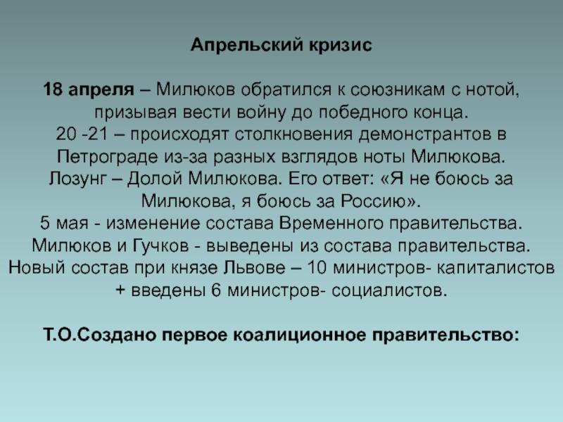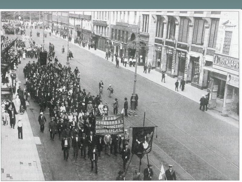 5 мая - изменение состава Временного правительства. Милюков и Гучков - выведены из состава правительства. Новый состав при князе Львове – 10 министров- капиталистов + введены 6 министров- социалистов.