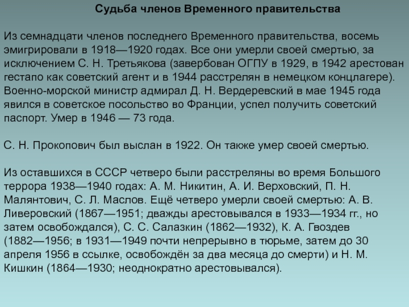 членов последнего Временного правительства, восемь эмигрировали в 1918—1920 годах. Все они умерли своей смертью, за исключением С. Н. Третьякова (завербован ОГПУ в 1929, в 1942 арестован гестапо как советский агент и в 1944 расстрелян в немецком концлагере). Военно-морской министр адмирал Д. Н. Вердеревский в мае 1945 года явился в советское посольство во Франции, успел получить советский паспорт. Умер в 1946 — 73 года.