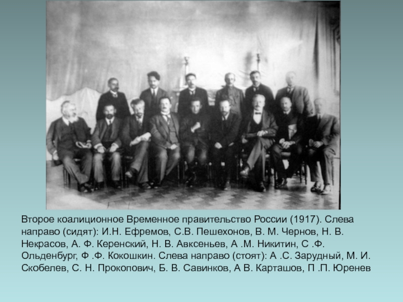 Слайд 19Второе коалиционное Временное правительство России (1917). Слева направо (сидят): И.Н.