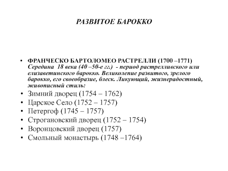 –50-е гг.) - период растрелливского или елизаветинского барокко. Великолепие развитого,
