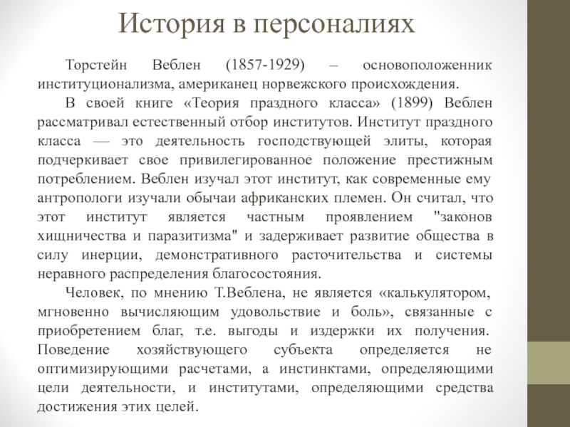 Человек, по мнению Т.Веблена, не является «калькулятором, мгновенно вычисляющим удовольствие и боль», связанные с приобретением благ, т.е. выгоды и издержки их получения. Поведение хозяйствующего субъекта определяется не оптимизирующими расчетами, а инстинктами, определяющими цели деятельности, и институтами, определяющими средства достижения этих целей.