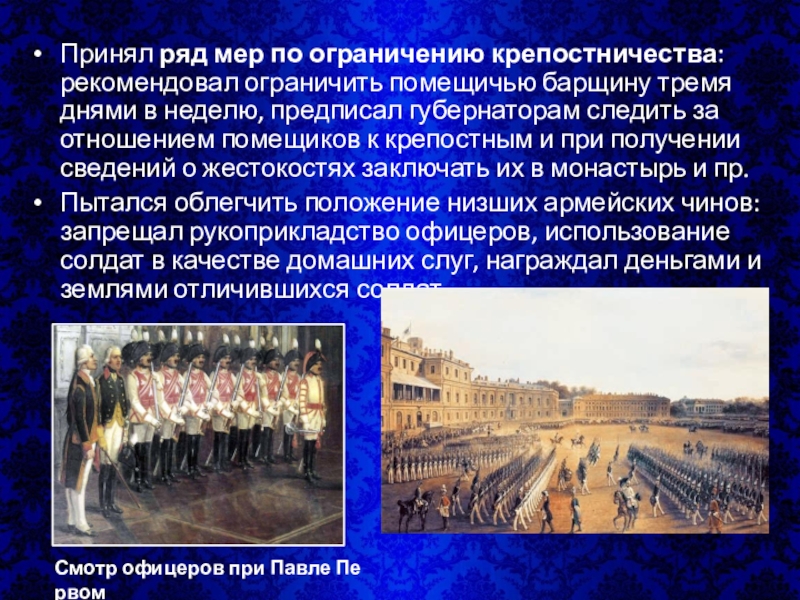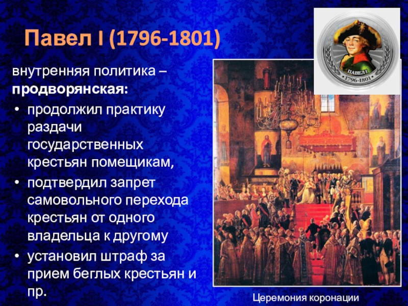 1797 г. - принят новый закон о престолонаследии, который отменял указ Петра I о назначении действующим императором своего наследника и устанавливал порядок перехода трона к старшему сыну, а при его отсутствии к старшему брату