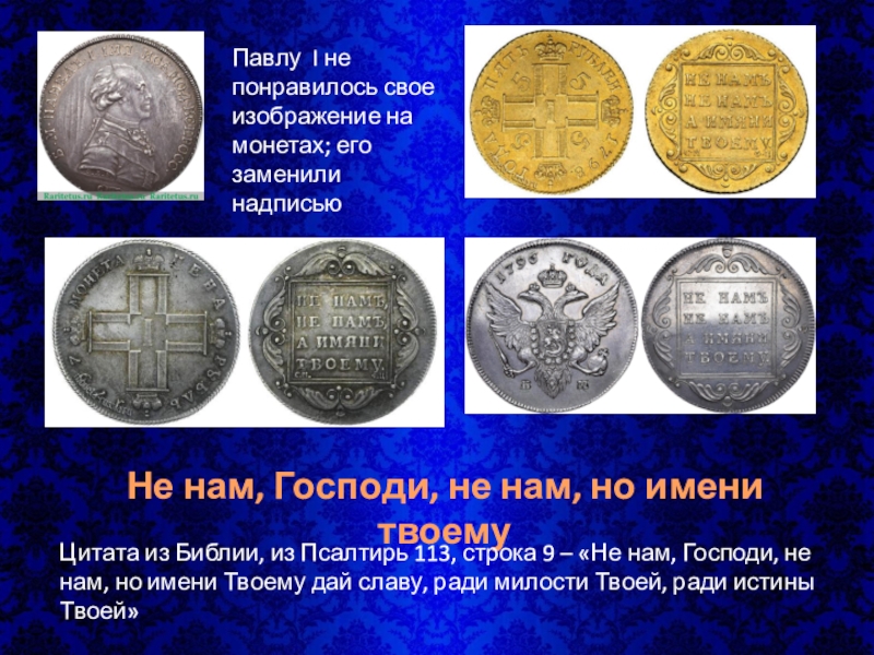 Павлу I не понравилось свое изображение на монетах; его заменили надписью