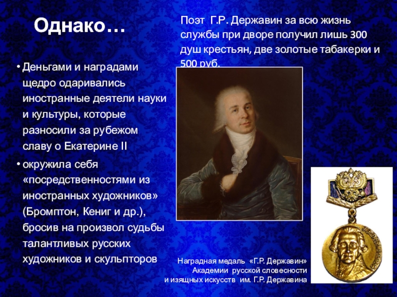 Поэт Г.Р. Державин за всю жизнь службы при дворе получил лишь 300 душ крестьян, две золотые табакерки и 500 руб.
