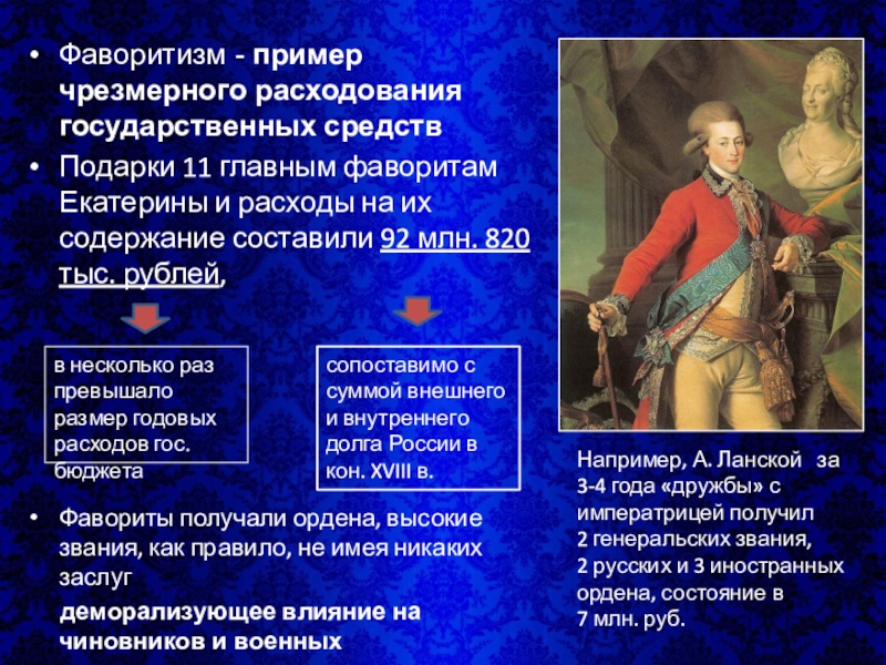 Например, А. Ланской за 3-4 года «дружбы» с императрицей получил 2 генеральских звания, 2 русских и 3 иностранных ордена, состояние в 7 млн. руб.