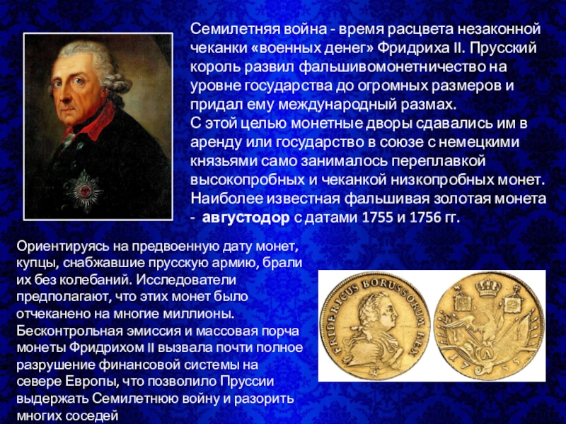 Бесконтрольная эмиссия и массовая порча монеты Фридрихом II вызвала почти полное разрушение финансовой системы на севере Европы, что позволило Пруссии выдержать Семилетнюю войну и разорить многих соседей