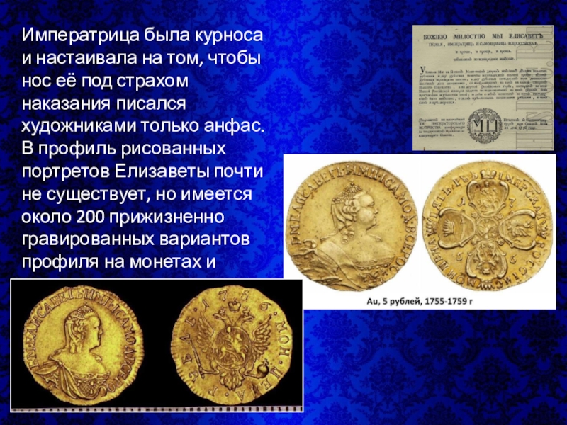 портретов Елизаветы почтине существует, но имеется около 200 прижизненно гравированных вариантов профиля на монетах и медальонах