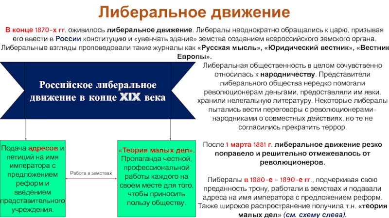 Либералы в 1880-е – 1890-е гг., подчеркивая свою преданность трону, работали в земствах и подавали адреса на имя императора с предложением реформ. Также широкое распространение получила т.н. «теория малых дел» (см. схему слева).