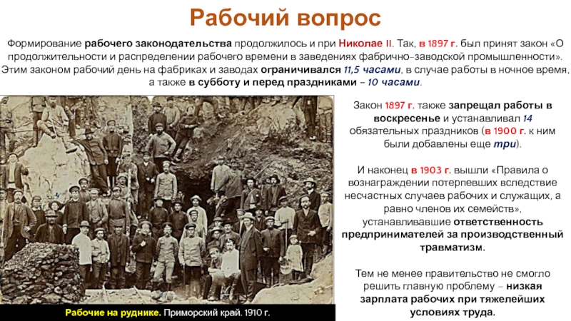 И наконец в 1903 г. вышли «Правила о вознаграждении потерпевших вследствие несчастных случаев рабочих и служащих, а равно членов их семейств», устанавливавшие ответственность предпринимателей за производственный травматизм.