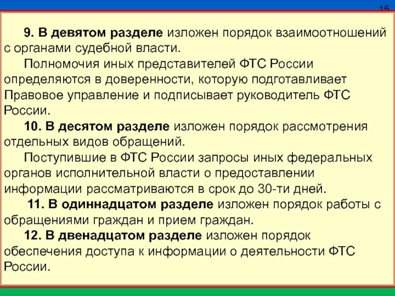 14. В четырнадцатом разделе изложен порядок предоставления информации о деятельности ФТС России (регионального таможенного управления, таможни, таможенного поста) по запросам.