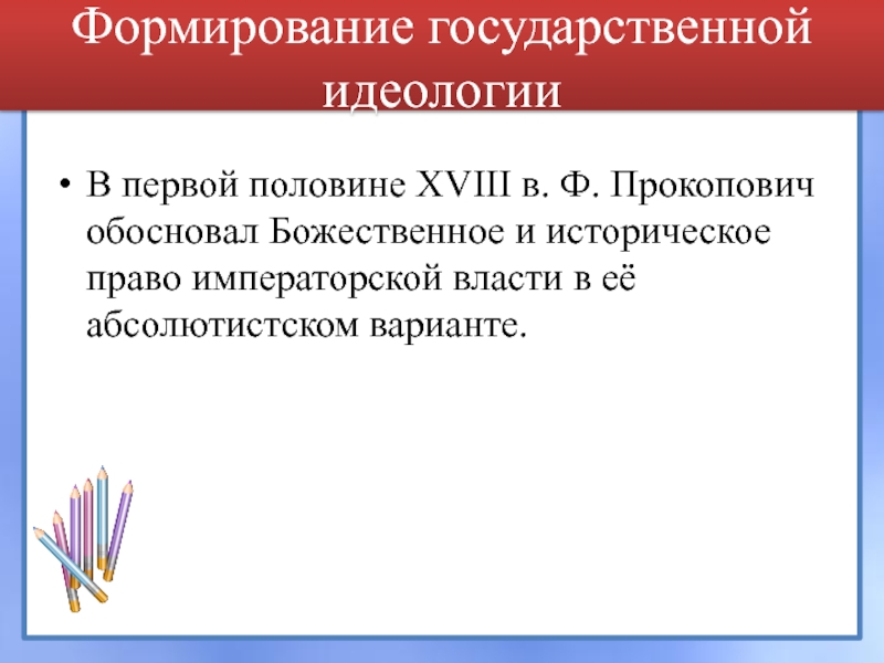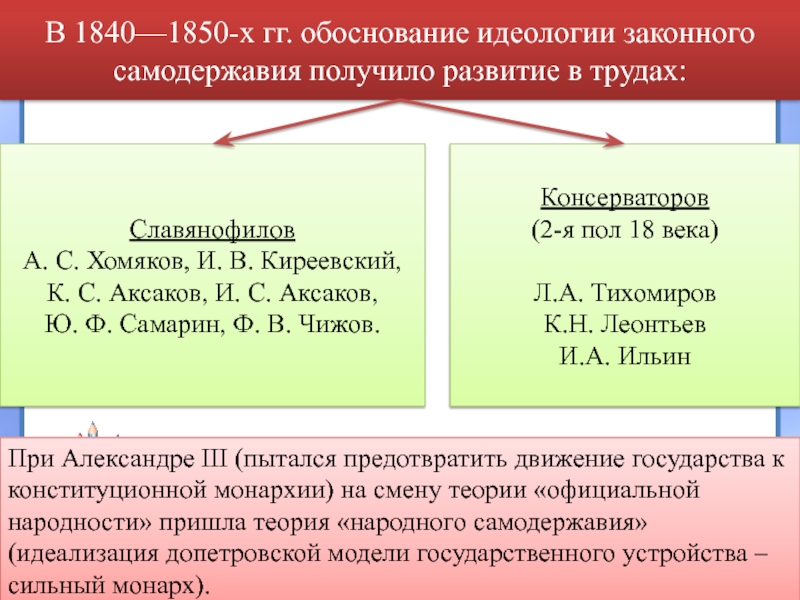При Александре III (пытался предотвратить движение государства к конституционной монархии) на смену теории «официальной народности» пришла теория «народного самодержавия» (идеализация допетровской модели государственного устройства – сильный монарх).