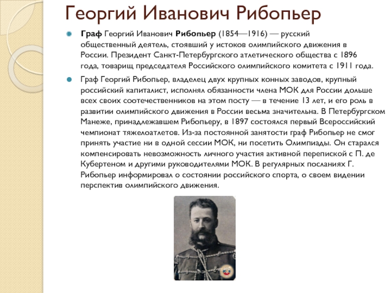 Граф Георгий Рибопьер, владелец двух крупных конных заводов, крупный российский капиталист, исполнял обязанности члена МОК для России дольше всех своих соотечественников на этом посту — в течение 13 лет, и его роль в развитии олимпийского движения в России весьма значительна. В Петербургском Манеже, принадлежавшем Рибопьеру, в 1897 состоялся первый Всероссийский чемпионат тяжелоатлетов. Из-за постоянной занятости граф Рибопьер не смог принять участие ни в одной сессии МОК, ни посетить Олимпиады. Он старался компенсировать невозможность личного участия активной перепиской с П. де Кубертеном и другими руководителями МОК. В регулярных посланиях Г. Рибопьер информировал о состоянии российского спорта, о своем видении перспектив олимпийского движения.