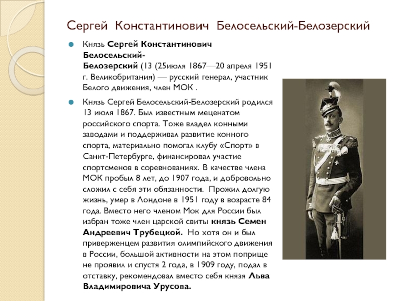 Князь Сергей Константинович Белосельский-Белозерский (13 (25июля 1867—20 апреля 1951 г. Великобритания) — русский