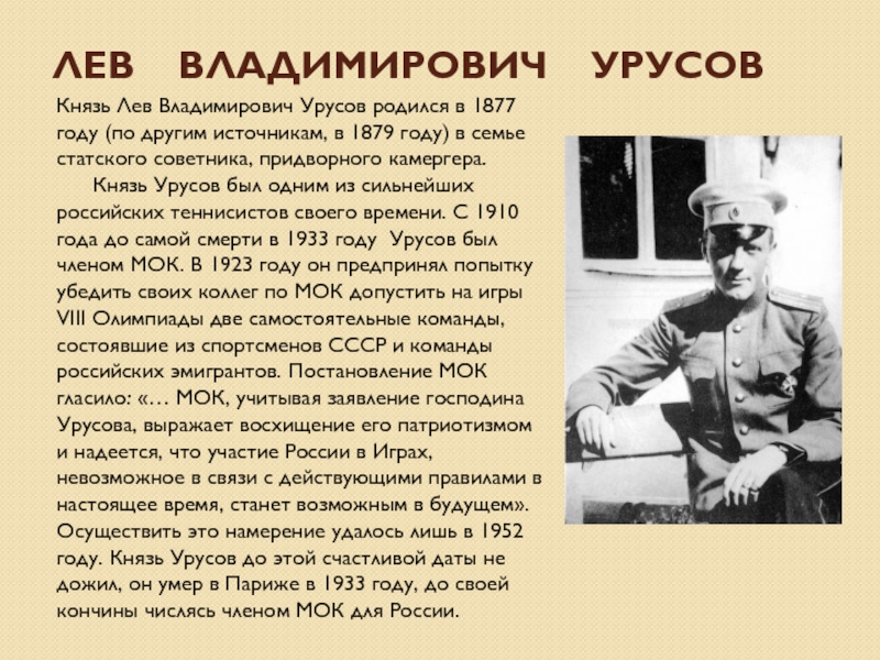 Князь Урусов был одним из сильнейших российских теннисистов своего времени. С 1910 года до самой смерти в 1933 году Урусов был членом МОК. В 1923 году он предпринял попытку убедить своих коллег по МОК допустить на игры VIII Олимпиады две самостоятельные команды, состоявшие из спортсменов СССР и команды российских эмигрантов. Постановление МОК гласило: «… МОК, учитывая заявление господина Урусова, выражает восхищение его патриотизмом и надеется, что участие России в Играх, невозможное в связи с действующими правилами в настоящее время, станет возможным в будущем». Осуществить это намерение удалось лишь в 1952 году. Князь Урусов до этой счастливой даты не дожил, он умер в Париже в 1933 году, до своей кончины числясь членом МОК для России.