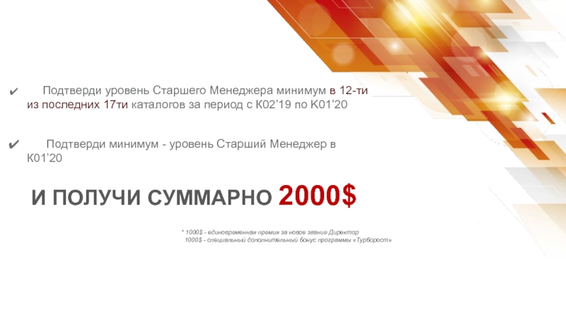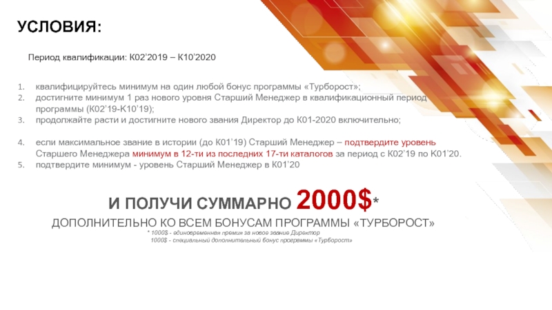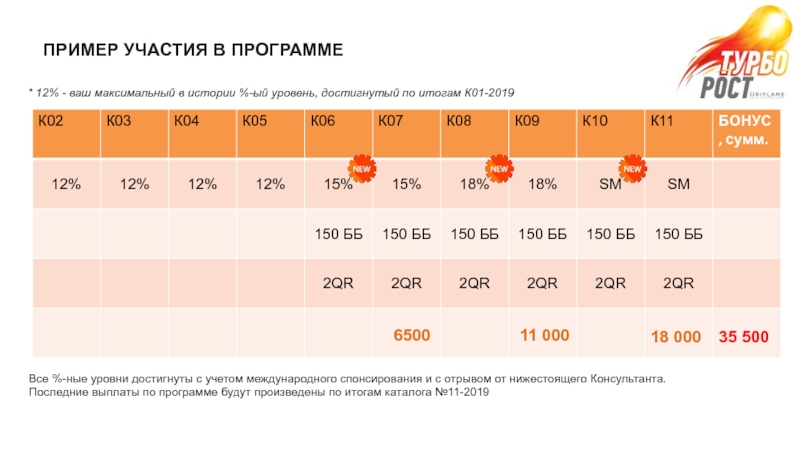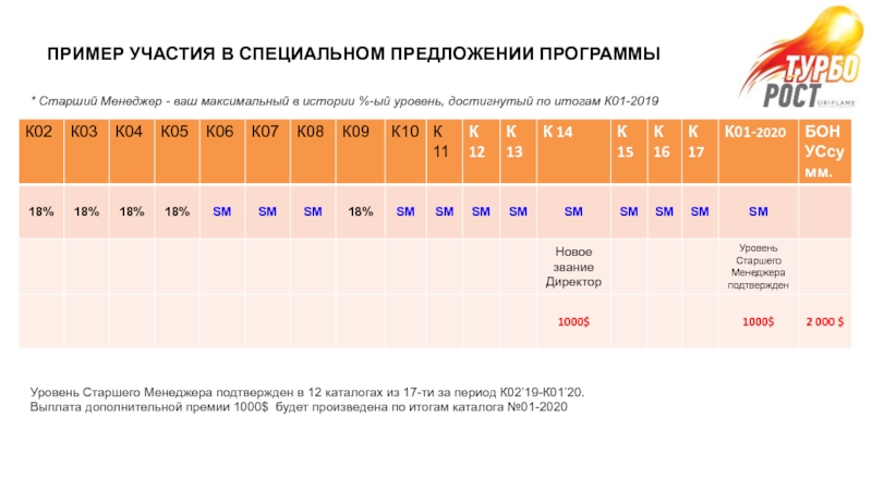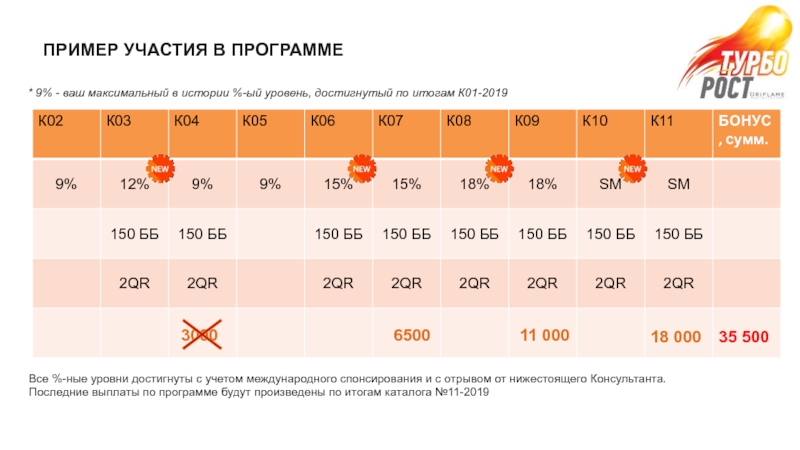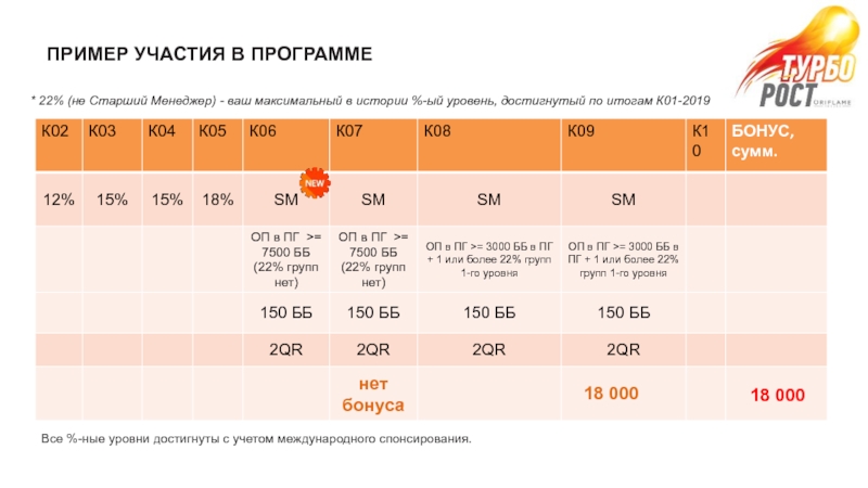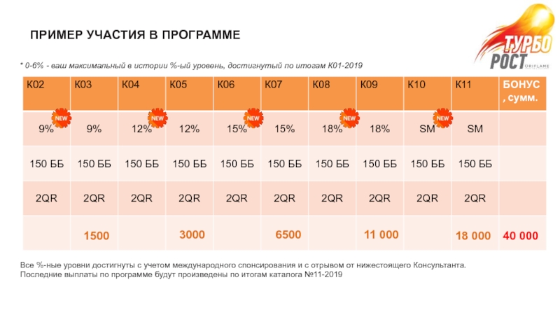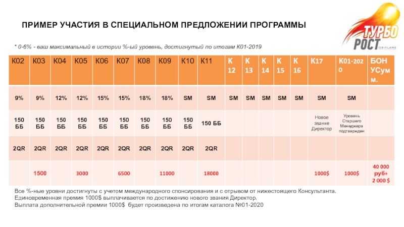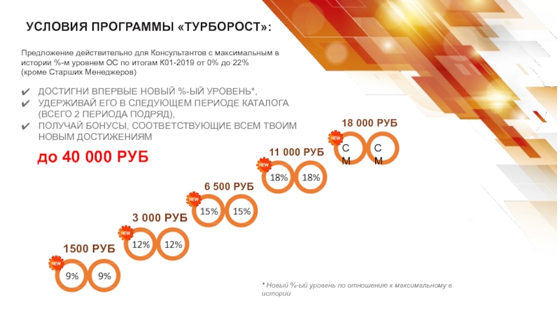 Предложение действительно для Консультантов с максимальным в истории %-м уровнем ОС по итогам К01-2019 от 0% до 22%