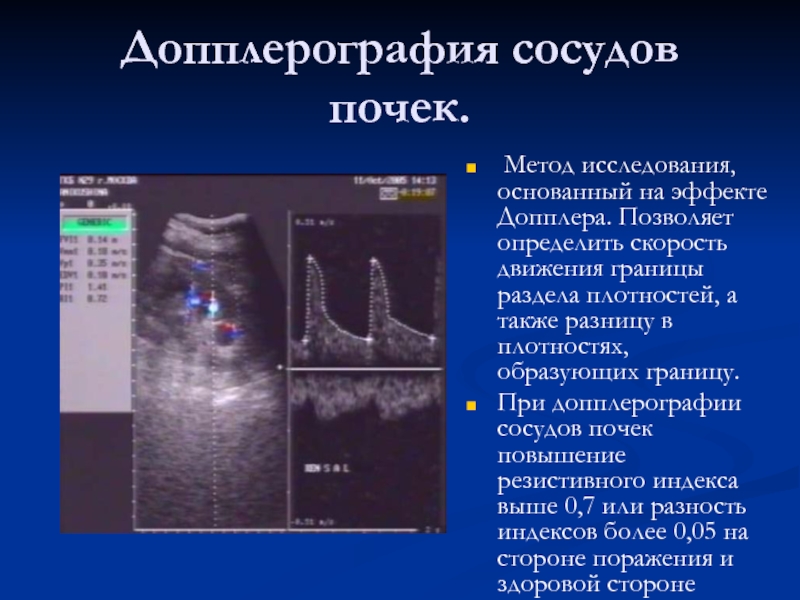 При допплерографии сосудов почек повышение резистивного индекса выше 0,7 или разность индексов более 0,05 на стороне поражения и здоровой стороне