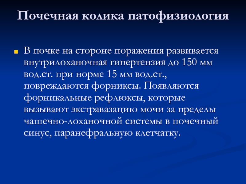 форниксы. Появляются форникальные рефлюксы, которые вызывают экстравазацию мочи за пределы чашечно-лоханочной системы в почечный синус, паранефральную клетчатку.