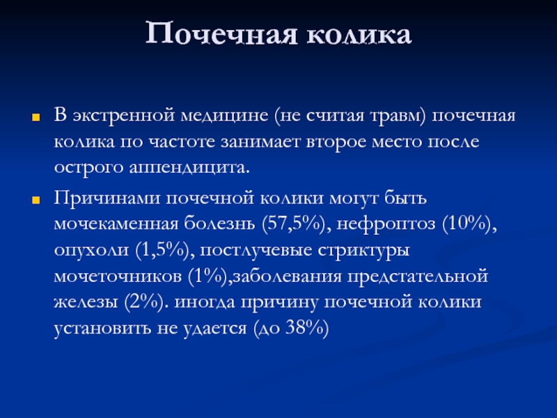 быть мочекаменная болезнь (57,5%), нефроптоз (10%), опухоли (1,5%), постлучевые стриктуры мочеточников (1%),заболевания предстательной железы (2%). иногда причину почечной колики установить не удается (до 38%)