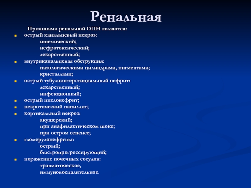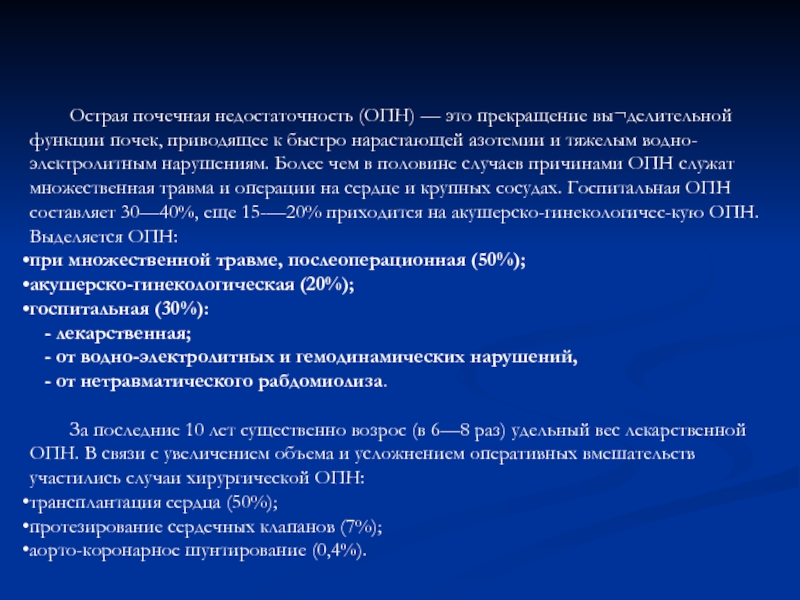 За последние 10 лет существенно возрос (в 6—8 раз) удельный вес лекарственной ОПН. В связи с увеличением объема и усложнением оперативных вмешательств участились случаи хирургической ОПН: