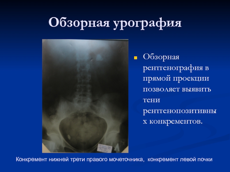Обзорная рентгенография в прямой проекции позволяет выявить тени рентгенопозитивных