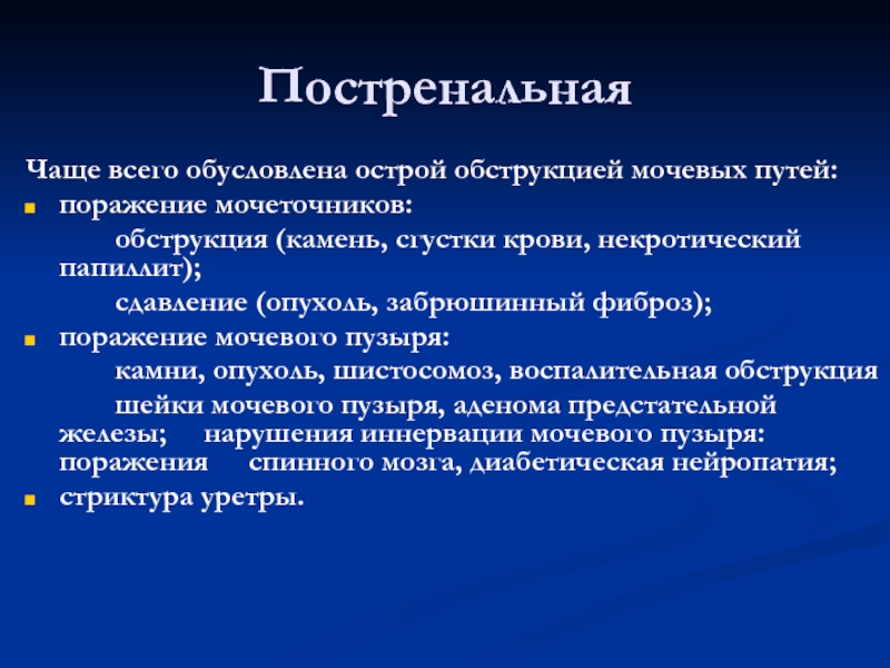 Чаще всего обусловлена острой обструкцией мочевых путей: