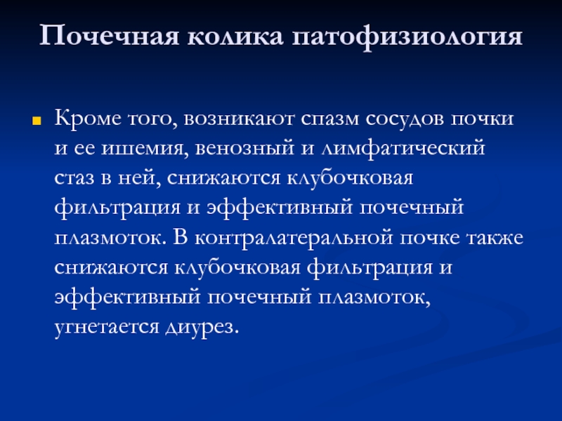 и эффективный почечный плазмоток. В контралатеральной почке также снижаются клубочковая фильтрация и эффективный почечный плазмоток, угнетается диурез.
