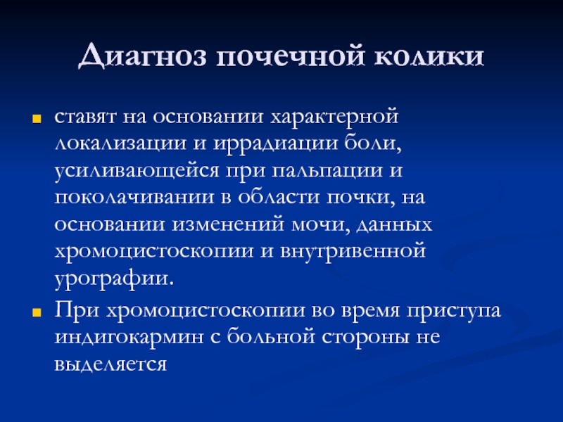 При хромоцистоскопии во время приступа индигокармин с больной стороны не выделяется