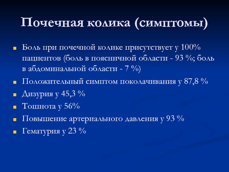 (боль в поясничной области - 93 %; боль в абдоминальной области -