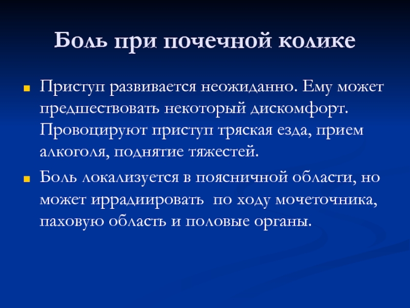 дискомфорт. Провоцируют приступ тряская езда, прием алкоголя, поднятие тяжестей.