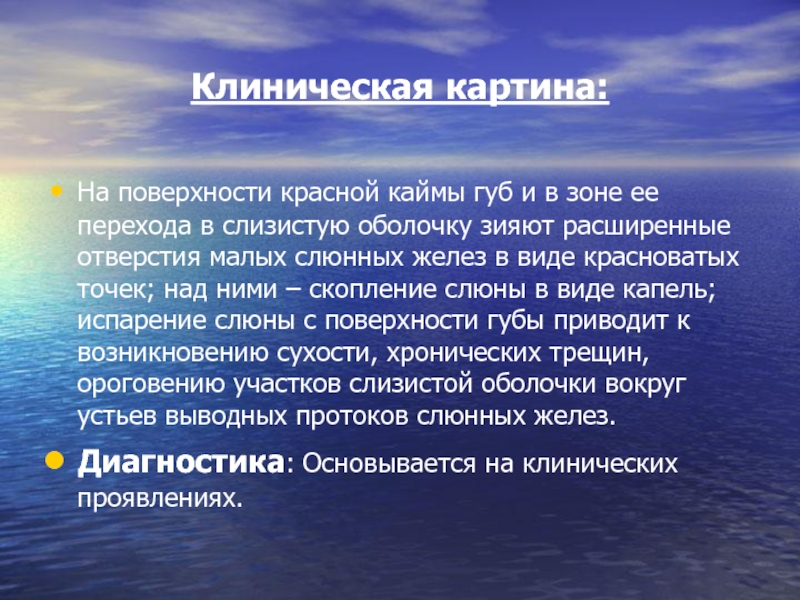 в виде красноватых точек; над ними – скопление слюны в виде капель; испарение слюны с поверхности губы приводит к возникновению сухости, хронических трещин, ороговению участков слизистой оболочки вокруг устьев выводных протоков слюнных желез.
