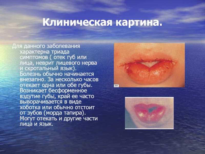 Симптомы. Возможно бессимптомное течение; распирание, онемение в области губ и языка.