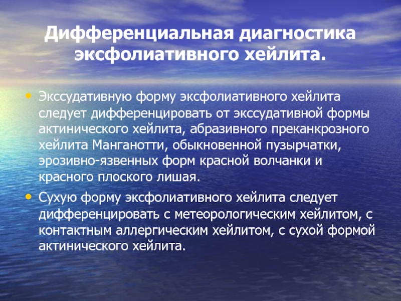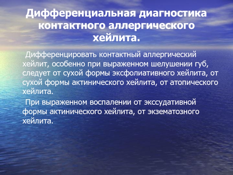 Сухую форму эксфолиативного хейлита следует дифференцировать с метеорологическим хейлитом, с контактным аллергическим хейлитом, с сухой формой актинического хейлита.